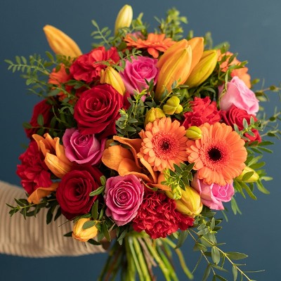 Ein lebhaftes Bouquet, das in reichem Rot, Pink und Orange erblüht. Es besteht aus Blumen wie sternförmigen Lilien, Rosen, Nelken und Gerbera und feiert kräftige und lebendige Farben, die die Sinne entfachen. Ein großes WOW zum kleinen Preis - dieses Bouquet bringt Freude und Lebhaftigkeit zu jedem Anlass und schont gleichzeitig deinen Geldbeutel. Das Bild zeigt die mittlere Größe.